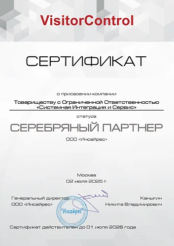 Компания «Системная Интеграция и Сервис» официально получила статус авторизованного серебряного партнёра компании ООО «Инсайрес» — российского разработчика современной системы учёта и контроля посетителей VisitorControl.